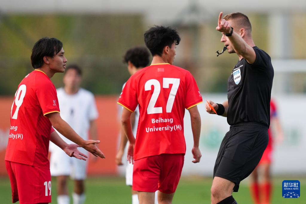 9月18日,主裁判向北京航空航天大学男足球员林扬(左)出示红牌。