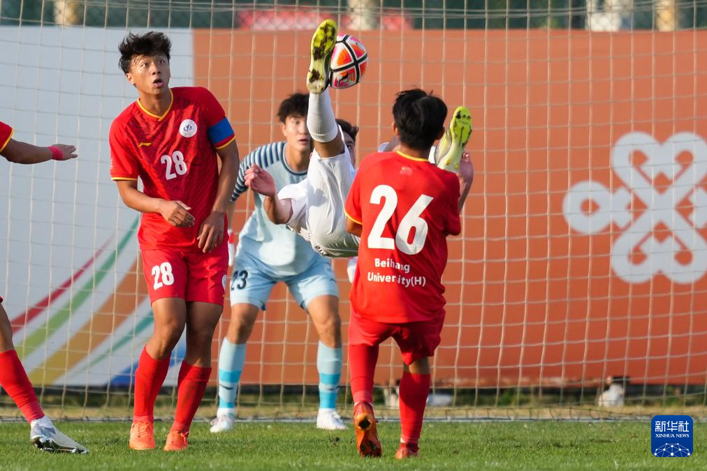9月18日,北京航空航天大学男足守门员吴思洁(右三)在比赛中扑救。