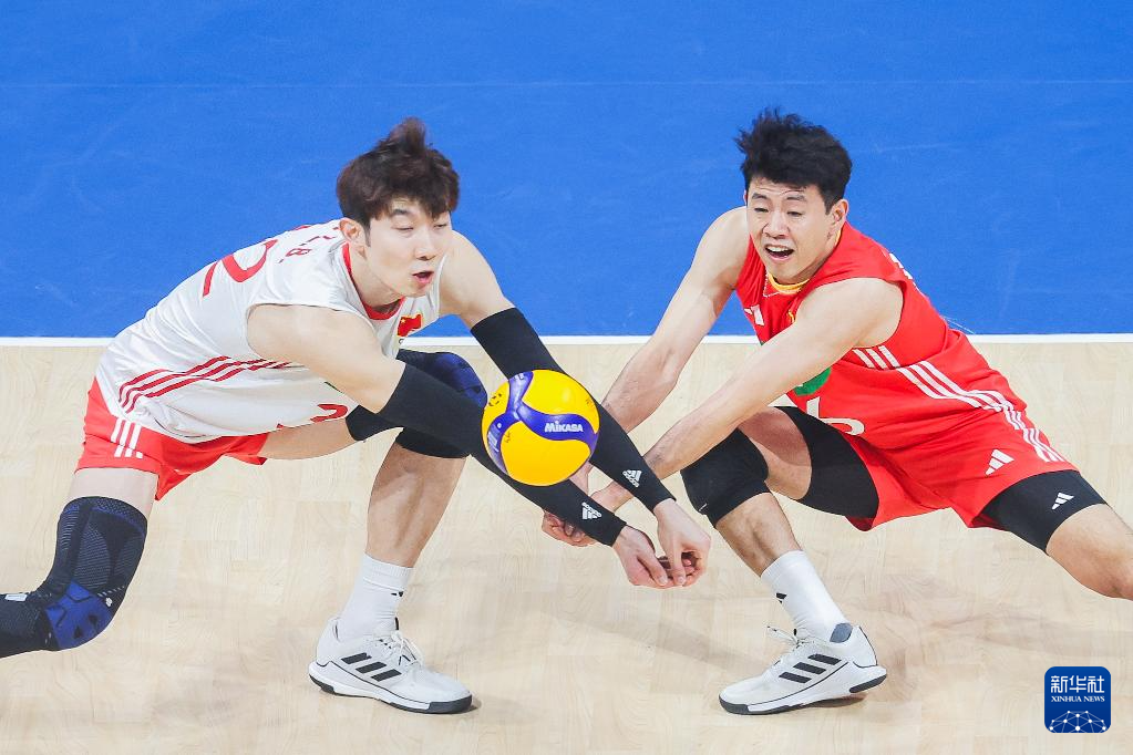 9月18日,中国队球员曲宗帅(右)、刘力宾在比赛中垫球。
