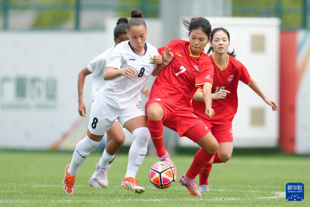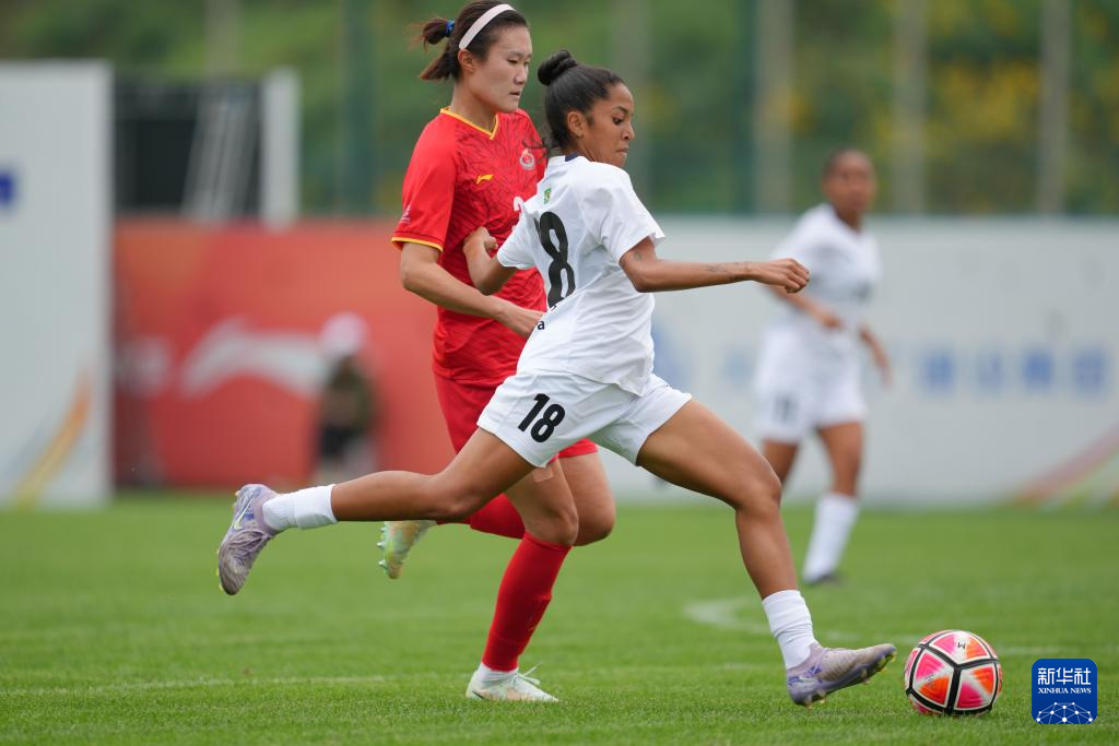 9月19日,上海体育大学女足球员郑佳怡(前右)在比赛中与圣卡塔琳娜南部大学女足球员德热苏斯(前左)拼抢。