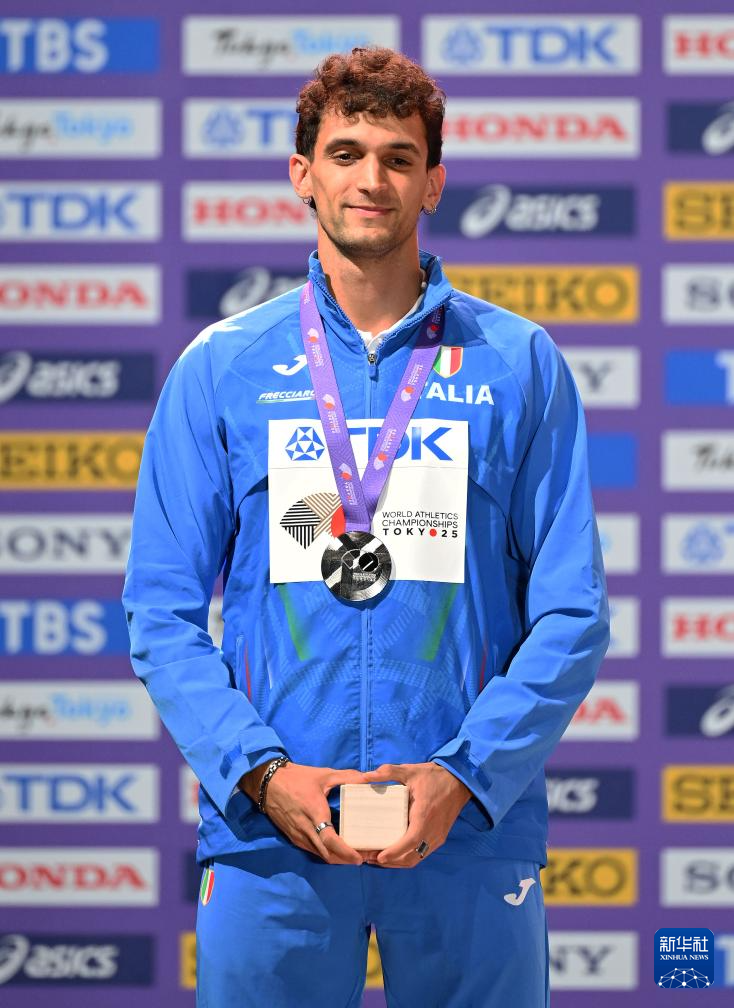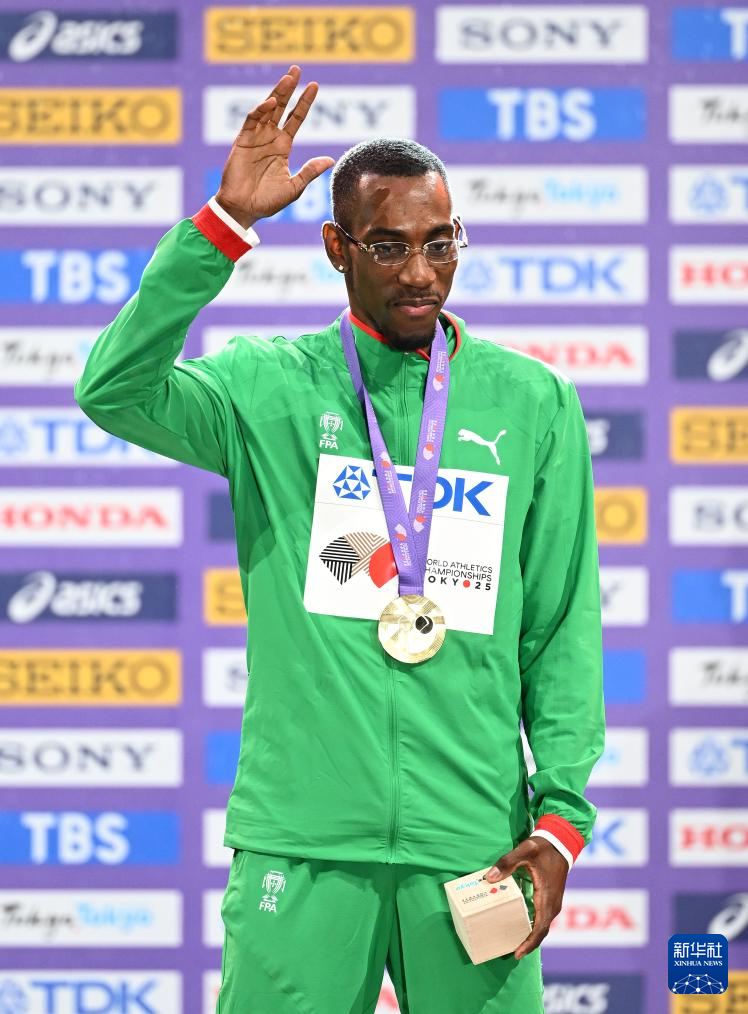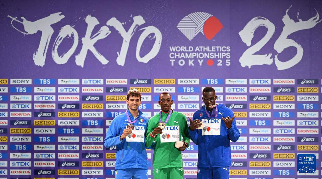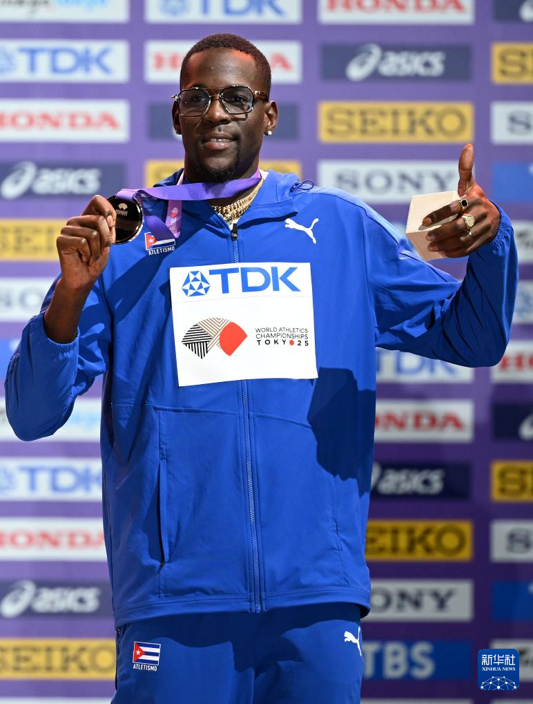 当日,2025年世界田径锦标赛男子三级跳远颁奖仪式在日本东京举行。