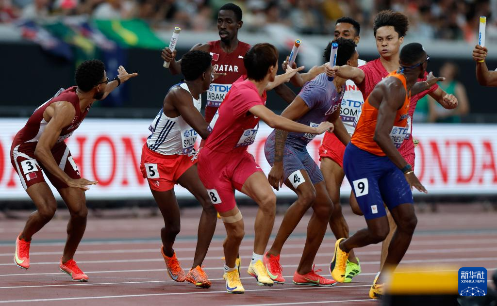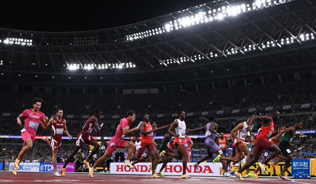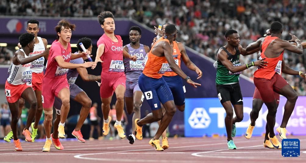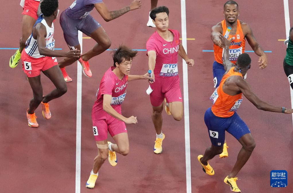 9月20日,中国队第三棒选手刘凯(左五)和第四棒郭龙宇(左三)在比赛中交接棒。