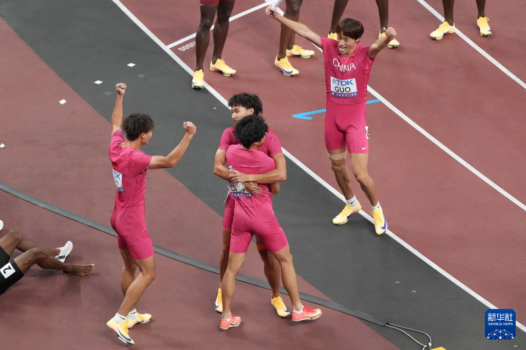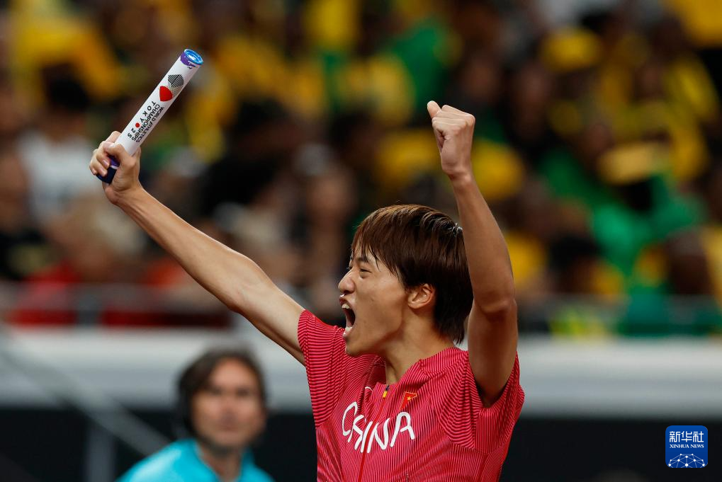 9月20日,中国队第四棒选手郭龙宇在比赛后庆祝。