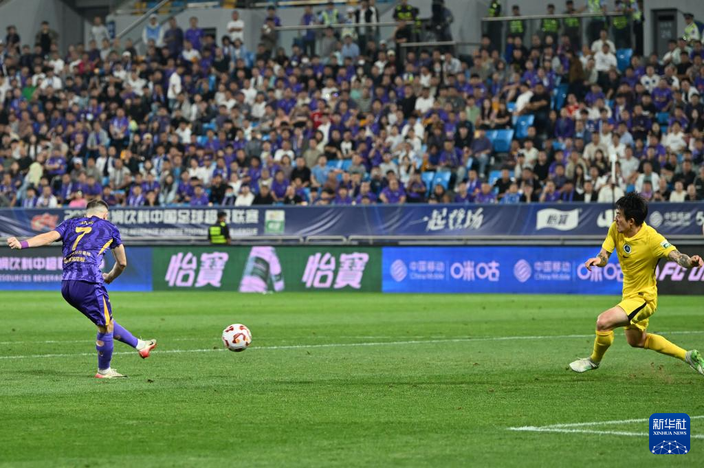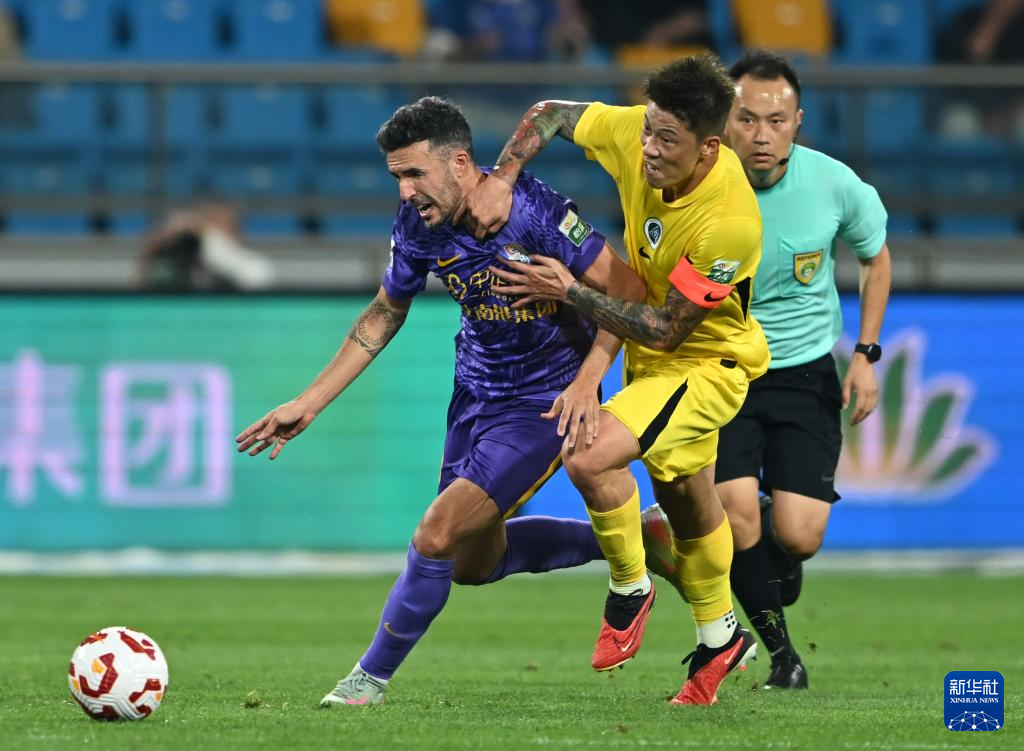 9月21日,深圳新鹏城队球员拜合拉木(左二)在比赛中射门。