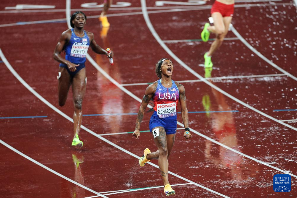 9月21日,美国队第四棒选手理查森(中)在决赛中冲过终点后庆祝。最终,美国队获得冠军。