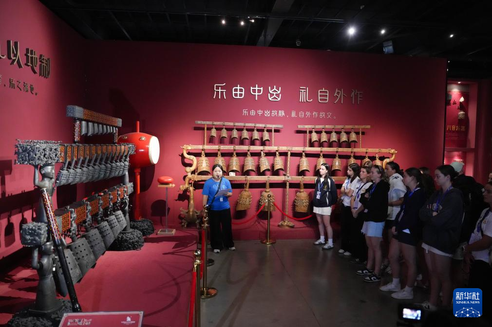 9月23日,球员们在世界音乐文化博物馆聆听讲解员介绍编钟。