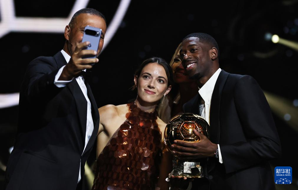 9月22日,男足金球奖获得者登贝莱(右一)、女足金球奖获得者邦马蒂(左二)在颁奖典礼上与主持人自拍合影。