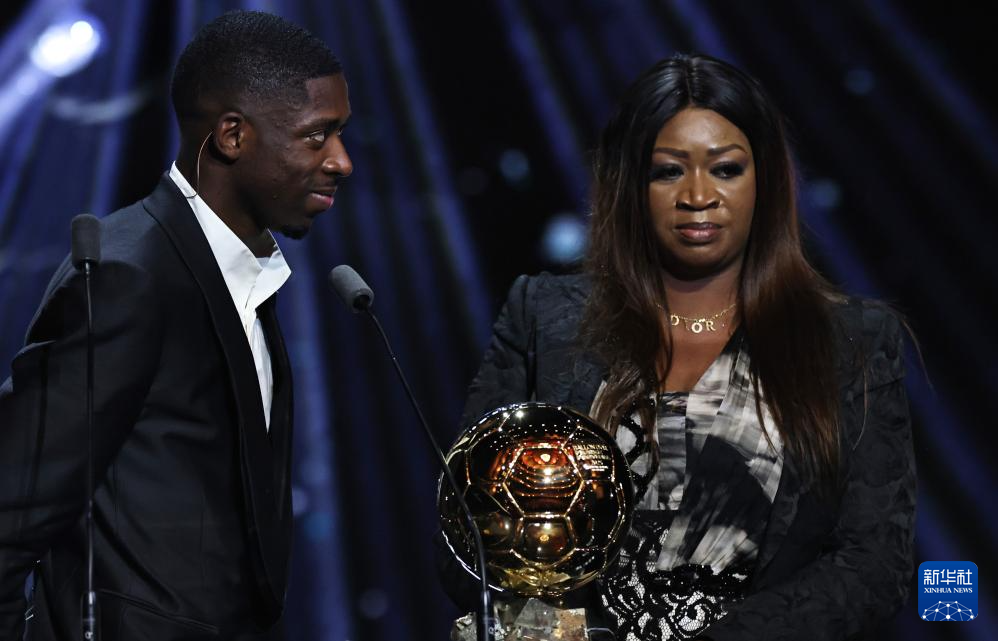 9月22日,巴黎圣日耳曼队法国球员登贝莱(左)与母亲在颁奖仪式上。登贝莱获颁男足金球奖。