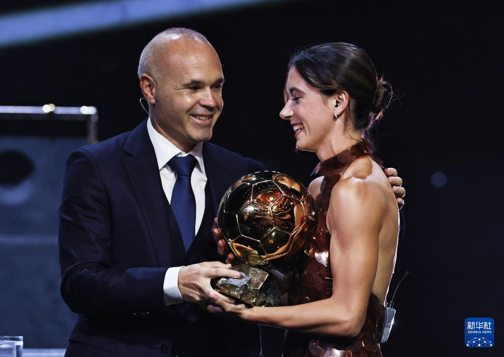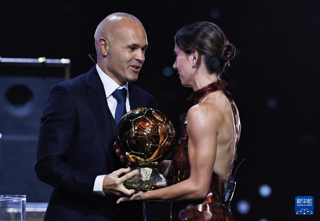 9月22日,巴塞罗那队西班牙球员邦马蒂(右)在颁奖仪式上从西班牙足球名宿伊涅斯塔手中接过女足金球奖杯。这是她连续第三年获得该奖项。