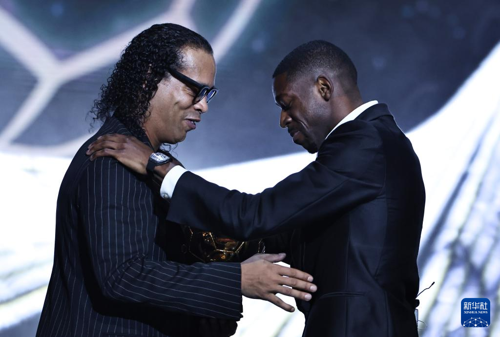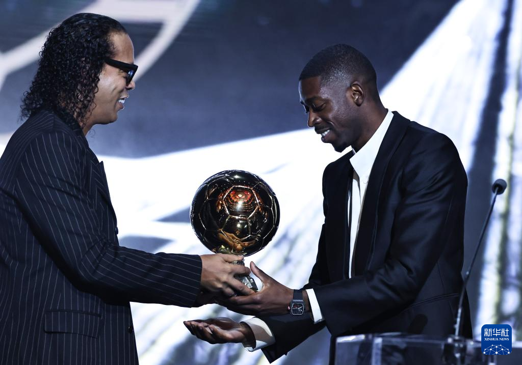 9月22日,巴黎圣日耳曼队法国球员登贝莱(右)从巴西足球名宿罗纳尔迪尼奥手中接过男足金球奖奖杯。