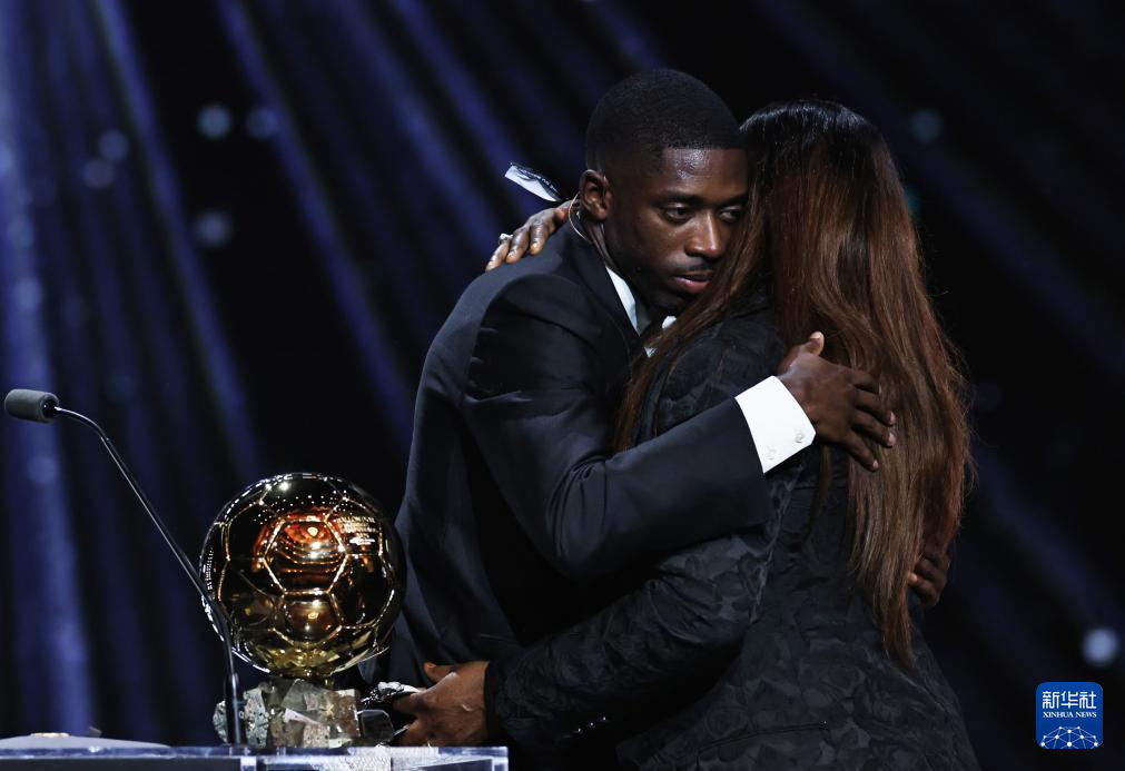 9月22日,巴黎圣日耳曼队法国球员登贝莱(左)与母亲在颁奖仪式上拥抱。登贝莱获颁男足金球奖。