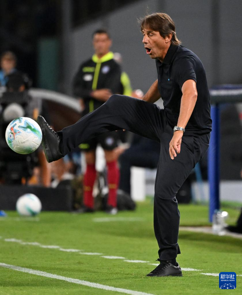 9月22日,那不勒斯队主教练孔蒂在场边停住出界的皮球。