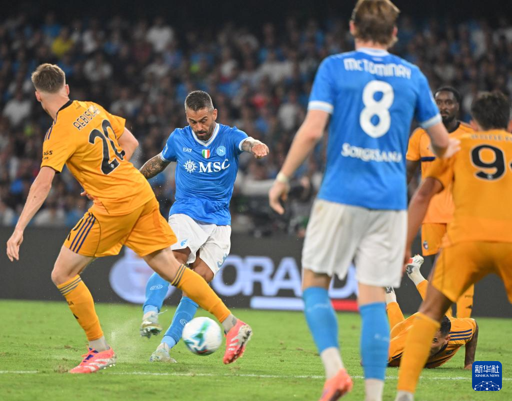 9月22日,那不勒斯队球员斯皮纳佐拉(左二)在比赛中射门。
