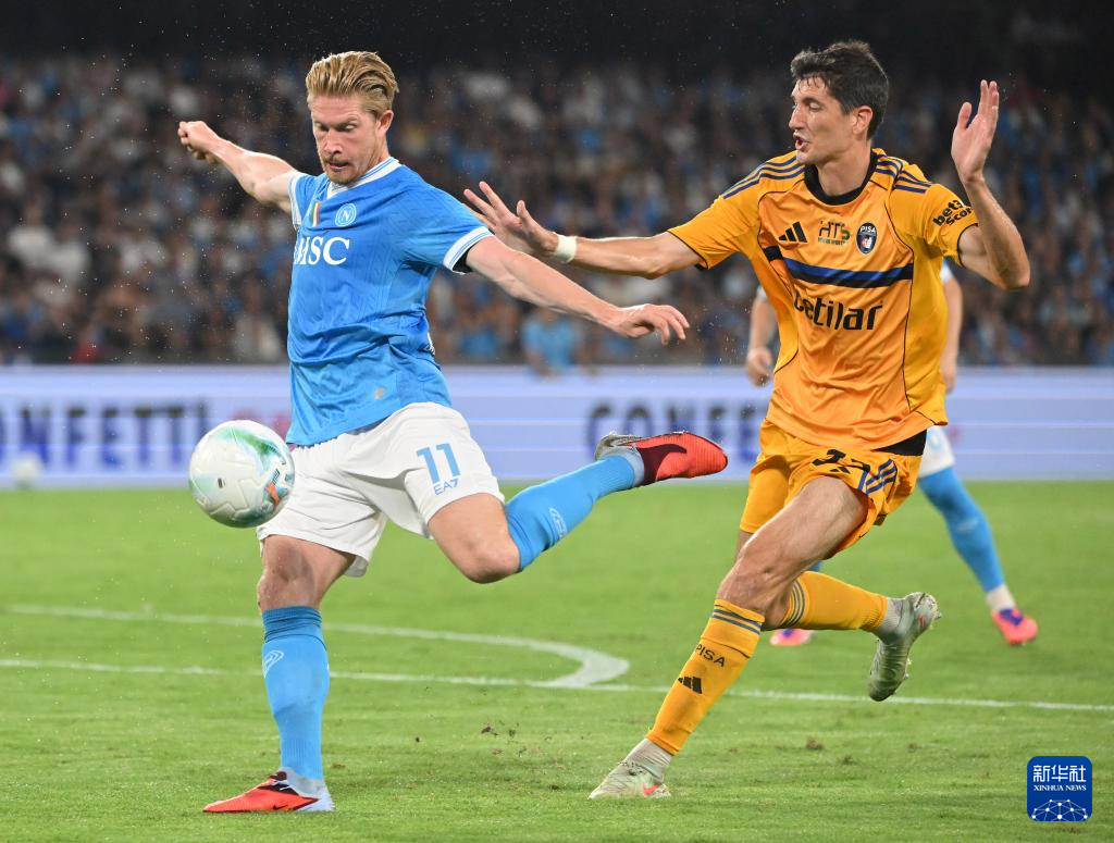 9月22日,那不勒斯队球员德布劳内(左)与比萨队球员莫雷奥拼抢