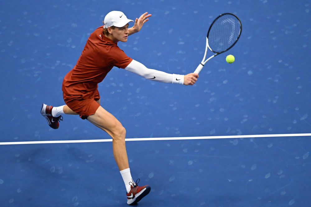 9月7日,辛纳在比赛中回球。当日,在2025美国网球公开赛男子单打决赛中,西班牙选手阿尔卡拉斯3比1战胜意大利选手辛纳,获得冠军。新华社记者 李睿 摄