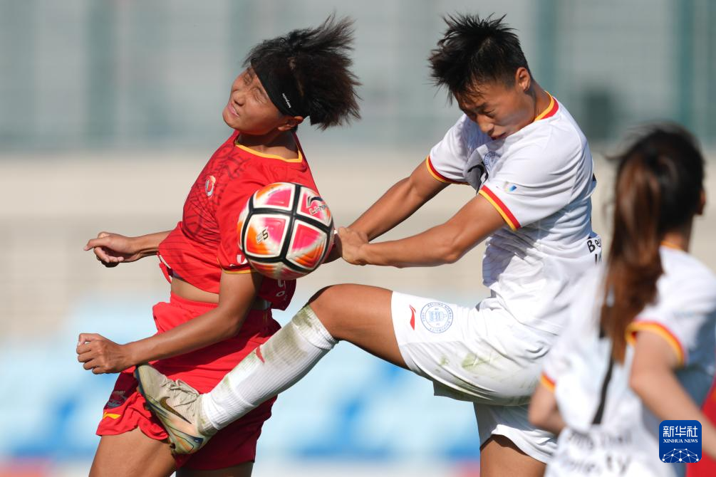 9月25日,上海体育大学女足球员郑嘉瑜(上左)、北京师范大学女足球员卢家玉(上右)在比赛中争顶。