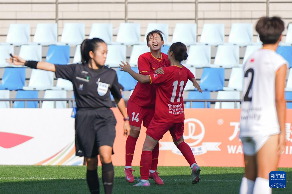 9月25日,上海体育大学女足球员刘璇(左二)在比赛中进球后与队友孙方欣(后右)庆祝。