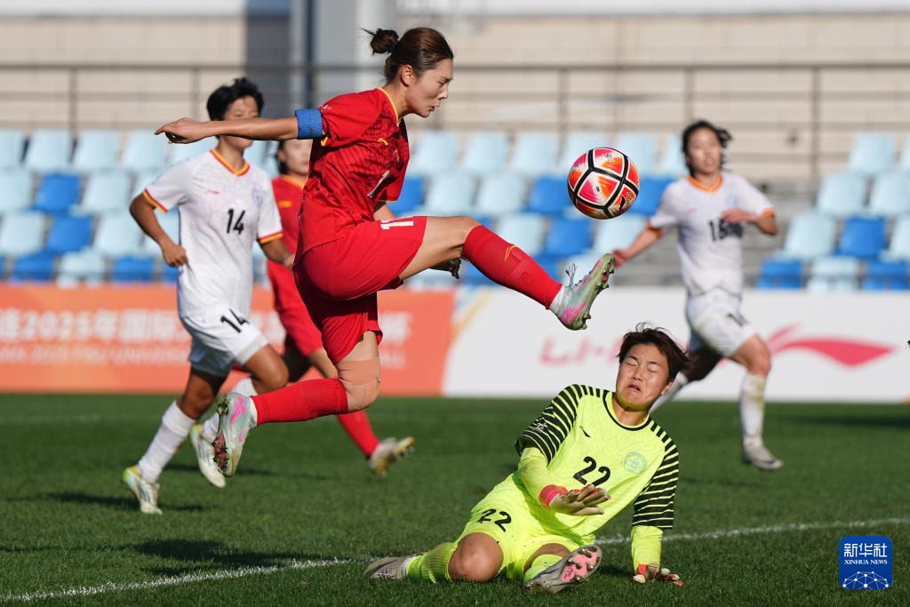 9月25日,上海体育大学女足球员刘璇(右二)在比赛中射门。