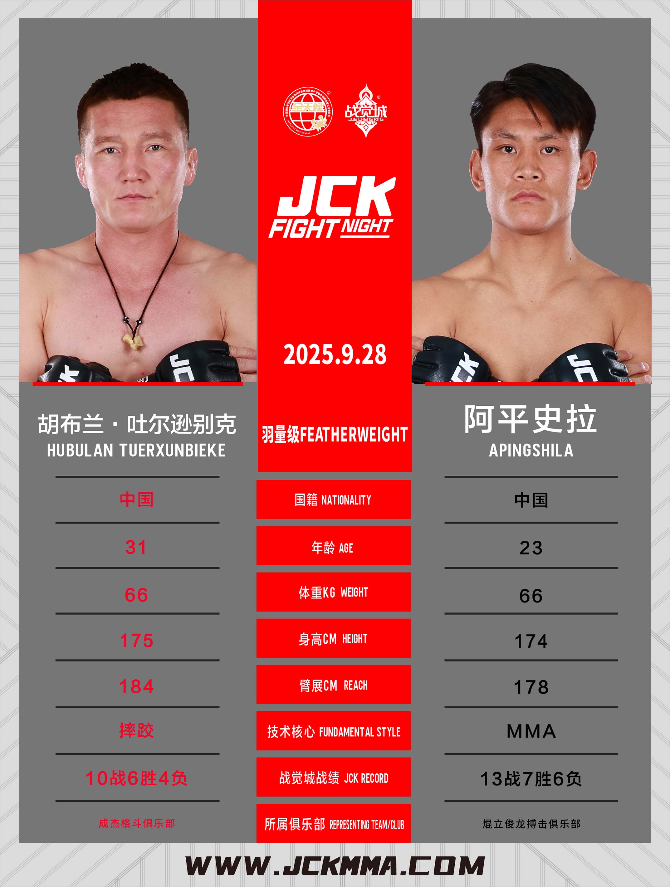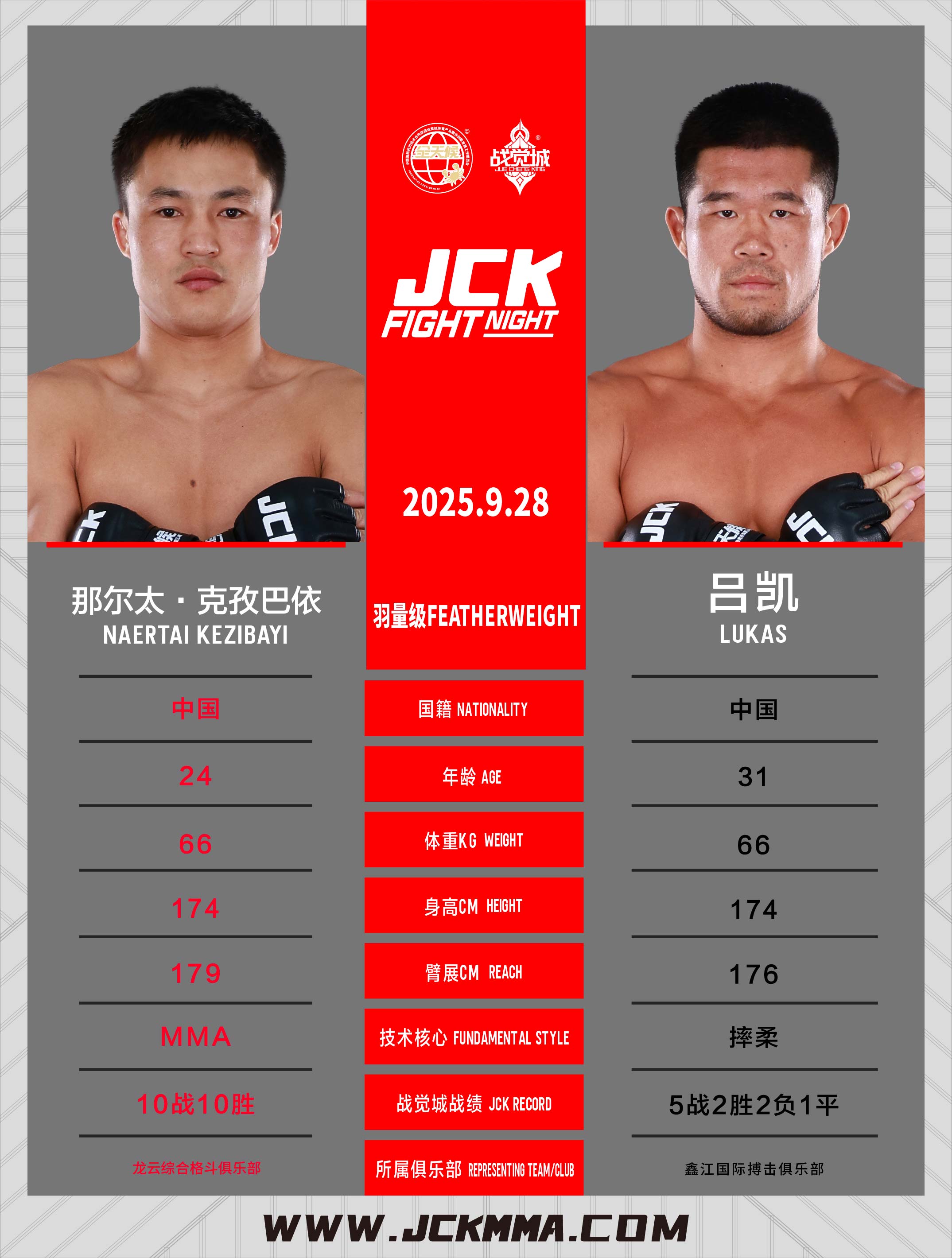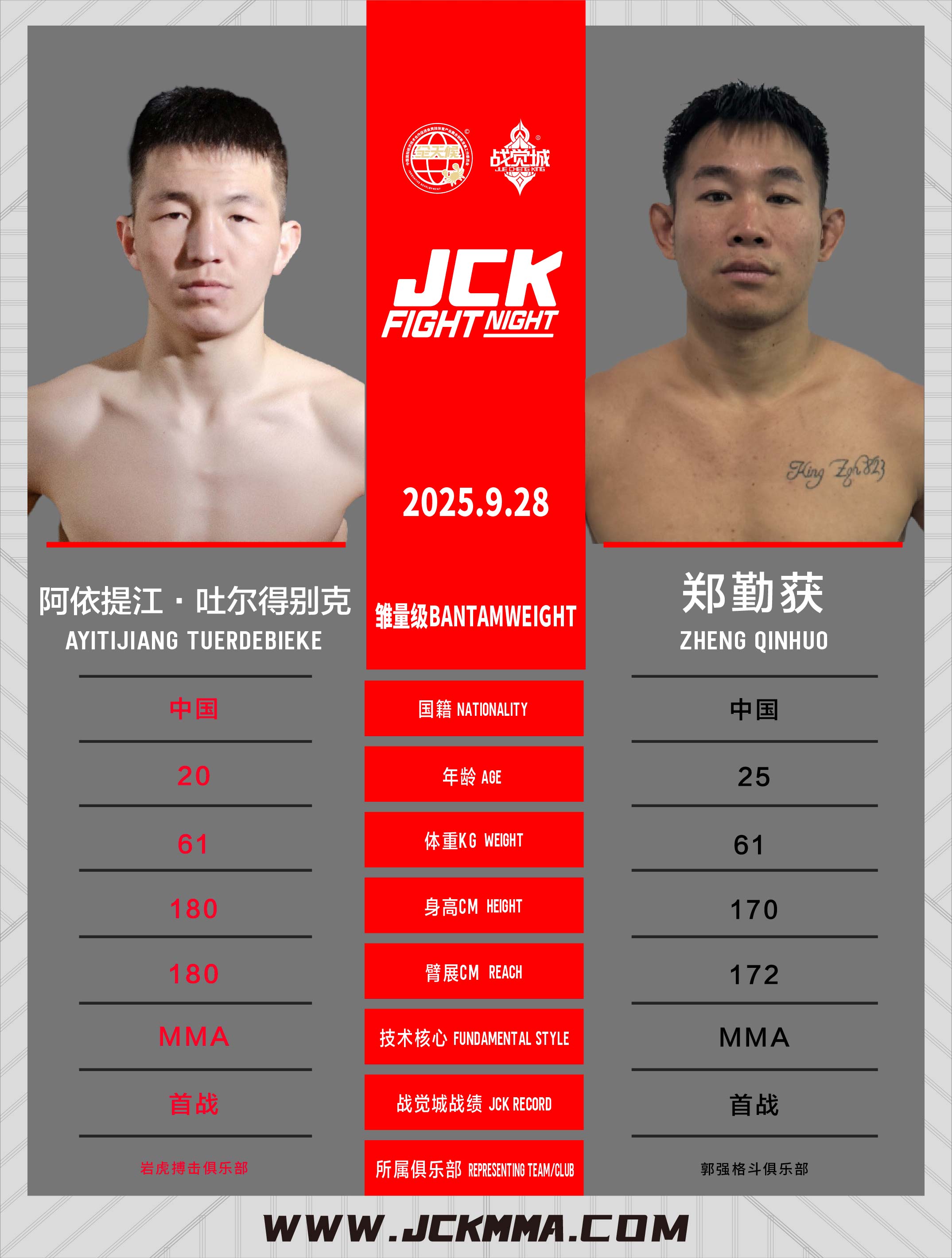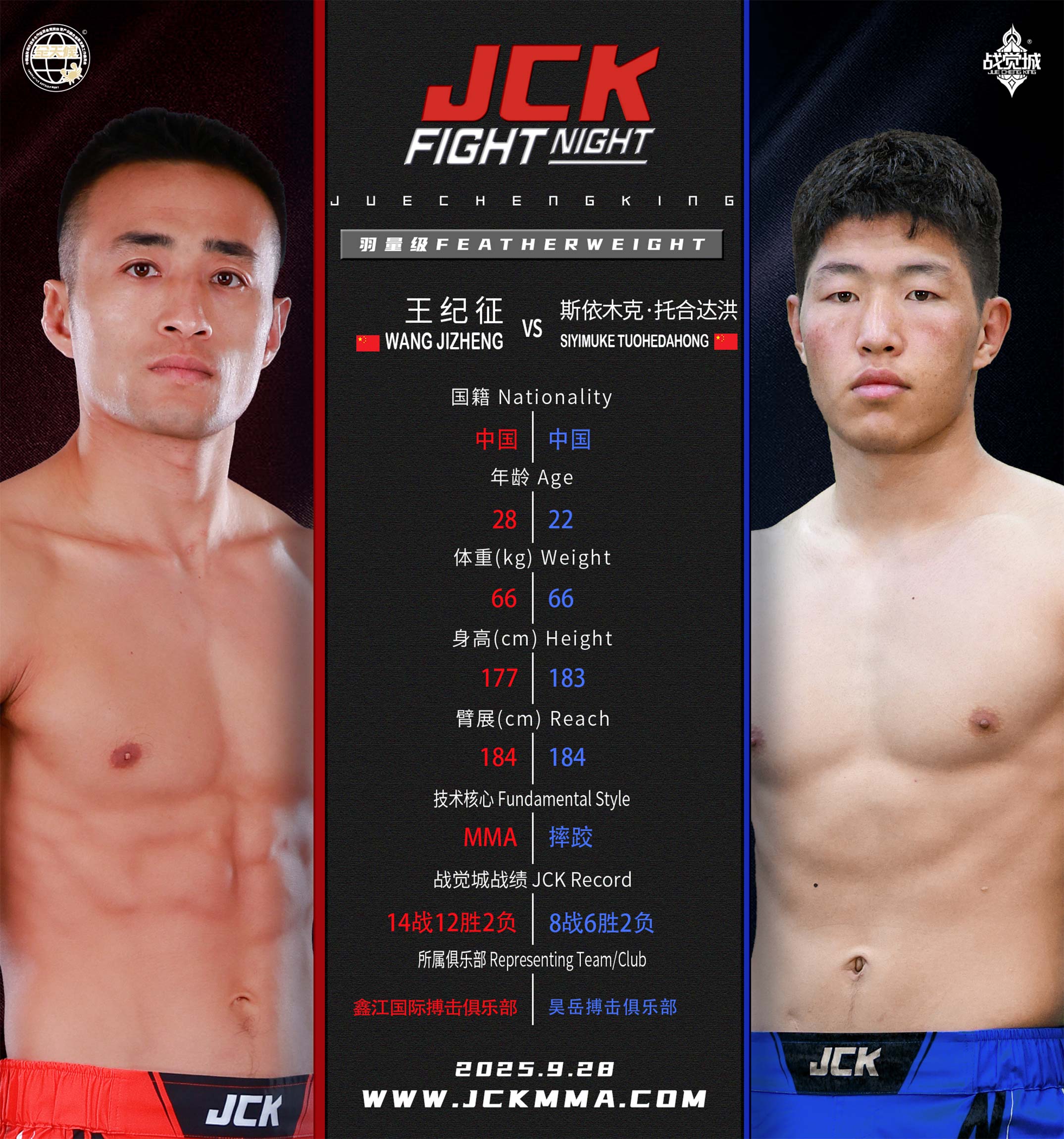 本周双赛!2025年9月28日,JCK觉城之夜N106将拉开羽量级赏金赛1/4决赛的序幕,具体阵容为:王纪征VS斯依木克·托合达洪、那尔太·克孜巴依VS吕凯、拉姆赞·阿赫马托夫VS腾力格、胡布兰·吐尔逊别克VS阿平史拉。