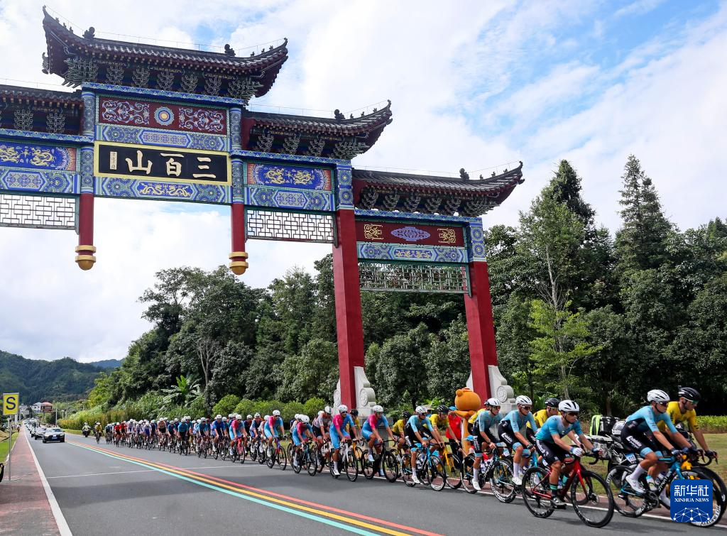 9月25日,参赛选手在比赛中骑行(无人机照片)。
