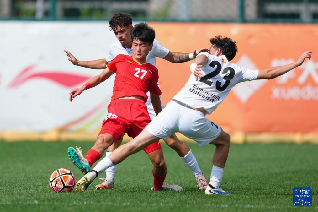 9月26日,拉蒙鲁尔大学男足球员卡斯特利斯(前左)和北京航空航天大学队球员林扬(前右)在比赛中拼抢。