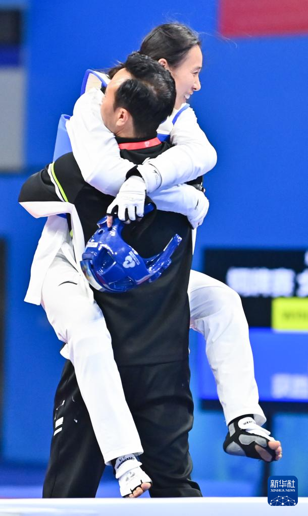 9月26日,湖南队选手邹芳(上)在比赛获胜后与教练拥抱庆祝。她2比0战胜河南队选手李静雯,获得铜牌。