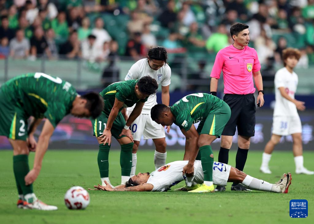 9月26日,北京国安队球员达万(前右二)帮助受伤的大连英博海发队球员佩尼亚(下)。