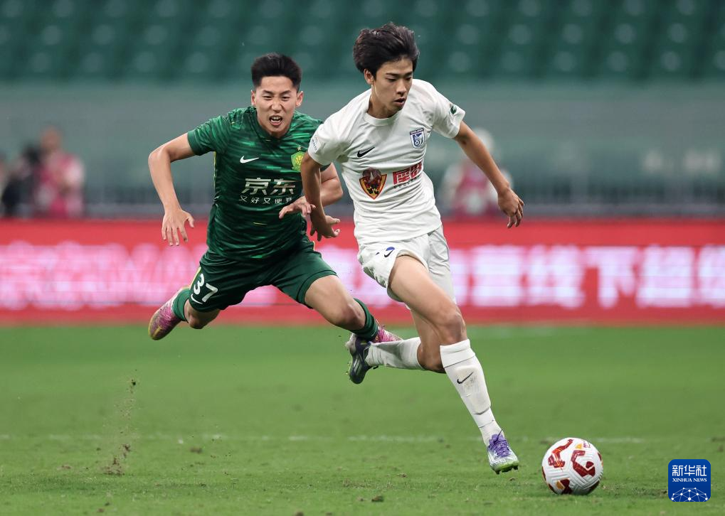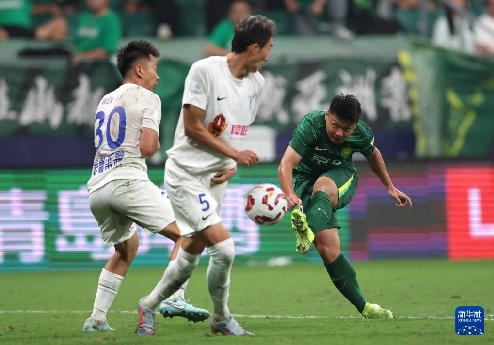 9月26日,北京国安队球员方昊(右)在比赛中射门。