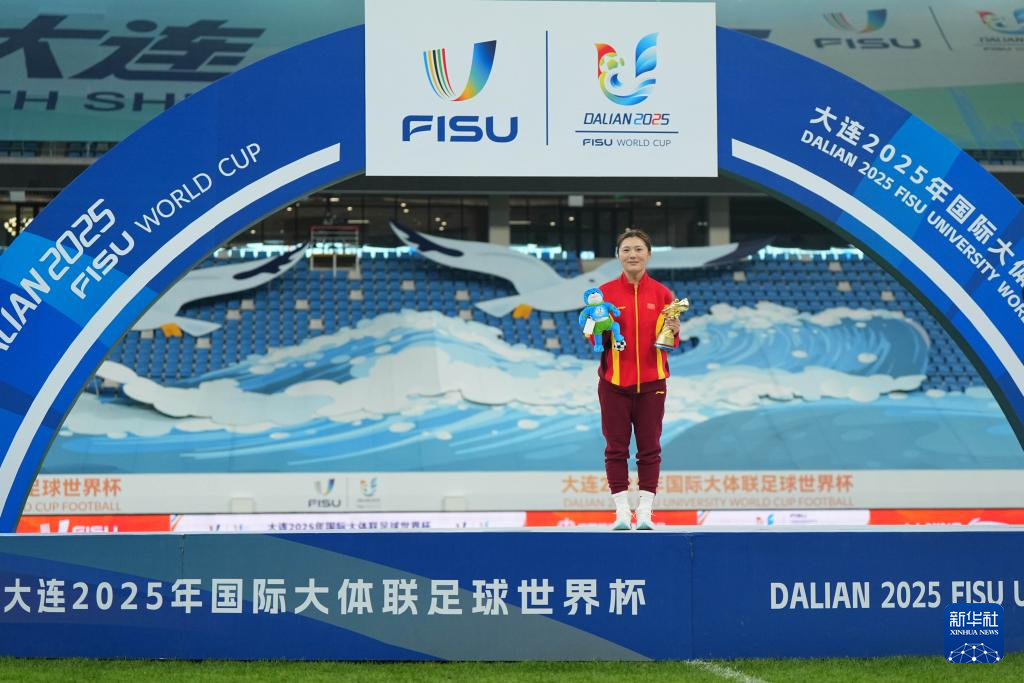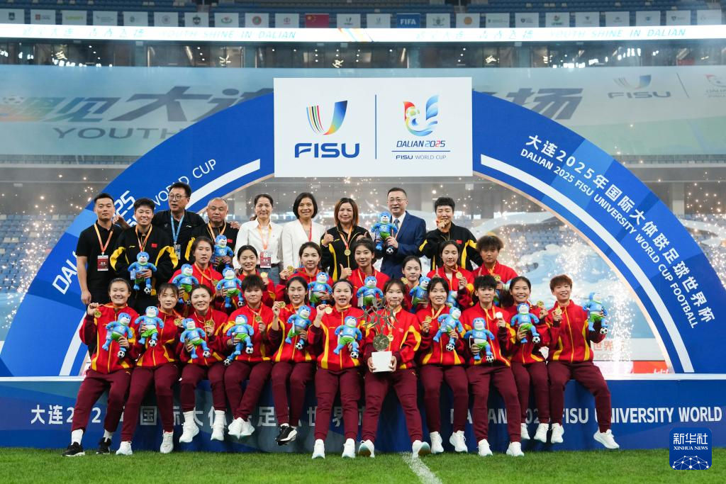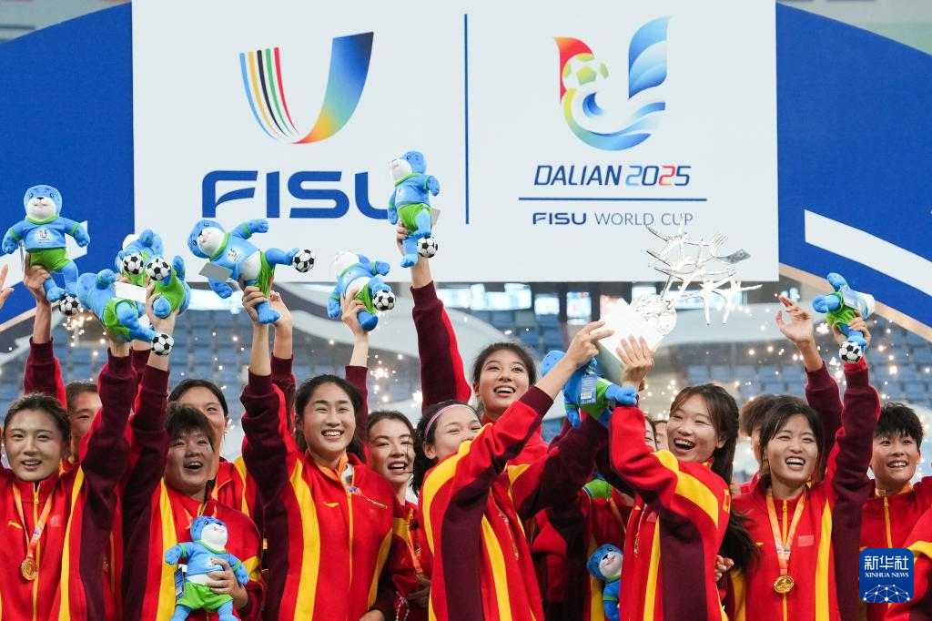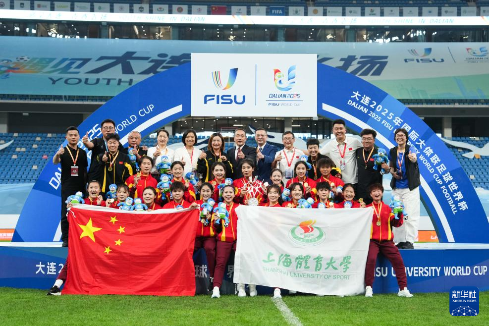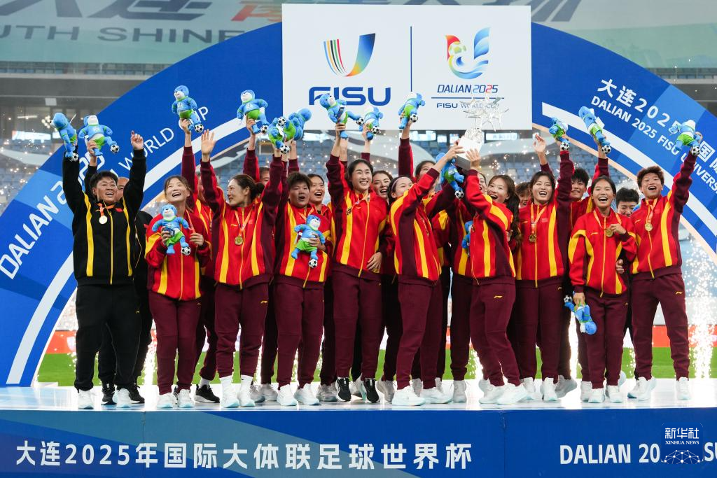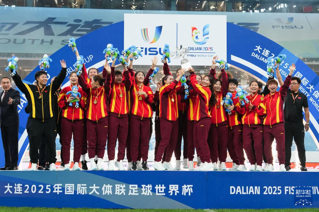 当日,在大连举行的2025年国际大体联足球世界杯女足决赛中,中国上海体育大学女足3比1战胜加拿大拉瓦尔大学女足,夺得冠军。