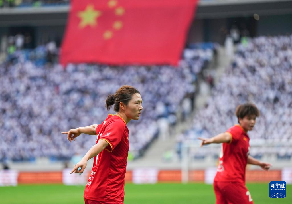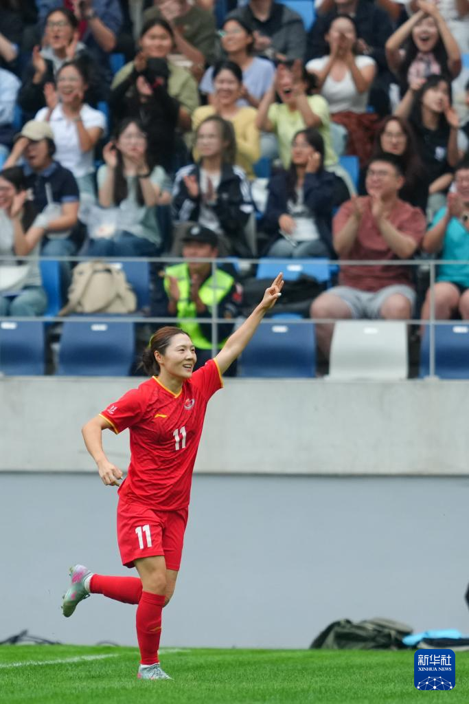 9月27日,上海体育大学女足球员在赛后庆祝胜利。