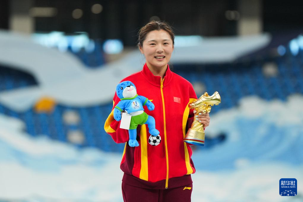 9月27日,获得最佳射手的上海体育大学女足球员孙方欣在颁奖仪式上。