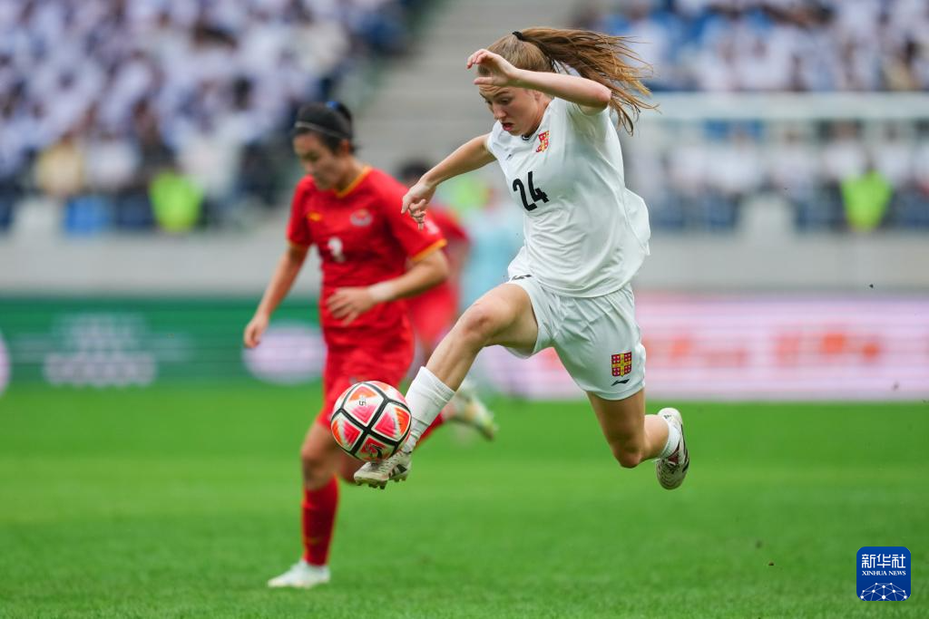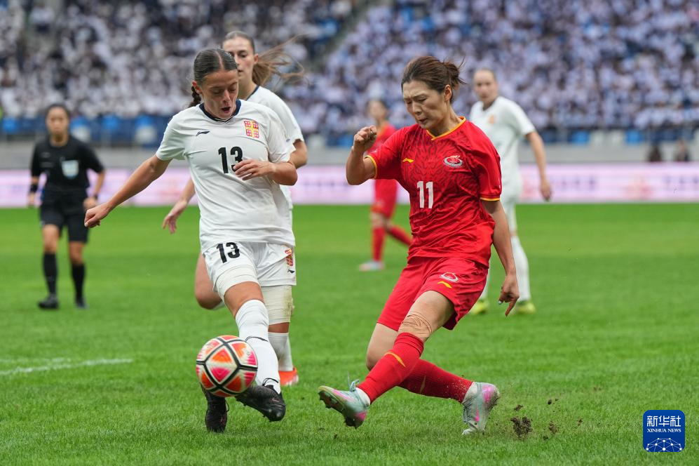 9月27日,上海体育大学女足球员李渟英格(左)在比赛中解围。