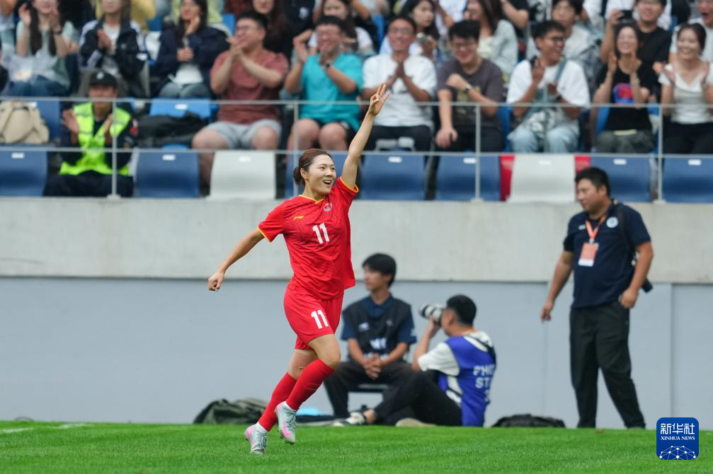 9月27日,上海体育大学女足球员孙方欣进球后庆祝。