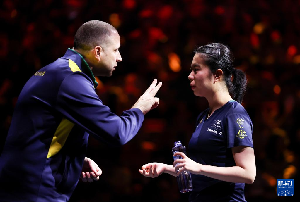 9月28日,刘杨子(右)在比赛间隙接受教练指导。