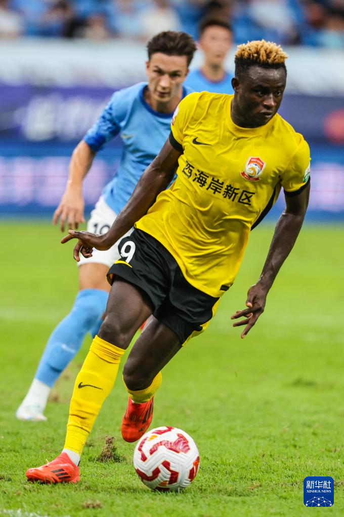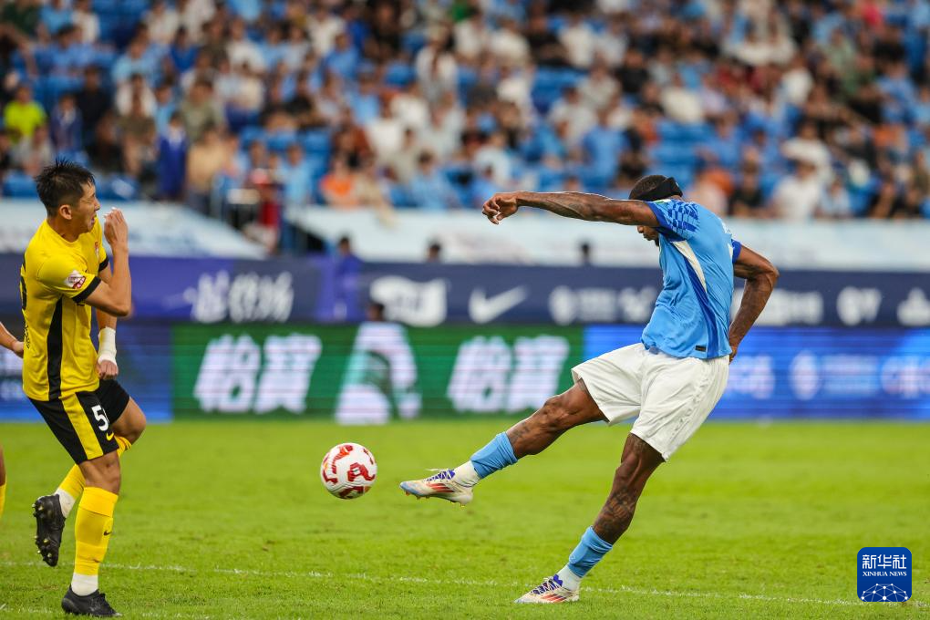 9月28日,深圳新鹏城队球员韦斯利(右)在比赛中射门。