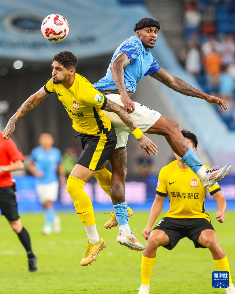 9月28日,青岛西海岸队球员里切利(上左)与深圳新鹏城队球员韦斯利(上右)在比赛中争抢头球。
