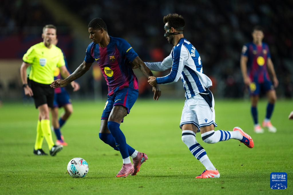 9月28日,巴塞罗那队球员拉什福德(前左)与皇家社会队球员门德斯在比赛中拼抢。