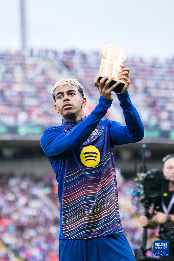 9月28日,巴塞罗那队球员亚马尔在比赛中展示自己赢得的2025科帕奖奖杯。