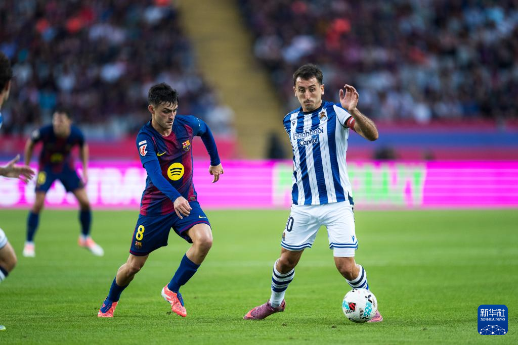 9月28日,巴塞罗那队球员佩德里(前左)与皇家社会队球员奥亚尔萨瓦尔在比赛中拼抢。