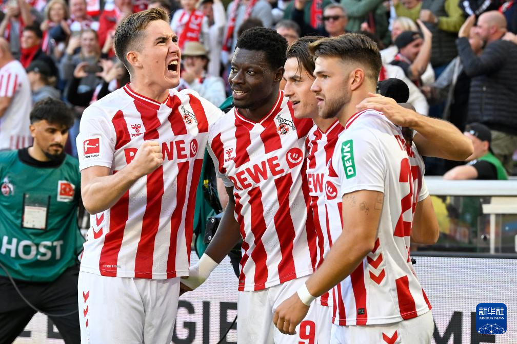 9月28日,科隆队球员卡明斯基(右二)和队友在比赛中庆祝得分。