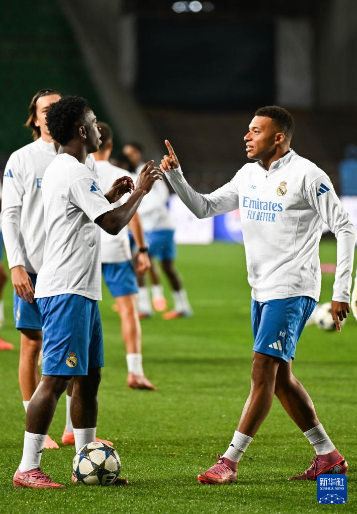 9月29日,皇家马德里队球员姆巴佩(右)和维尼修斯(左前)在训练中。