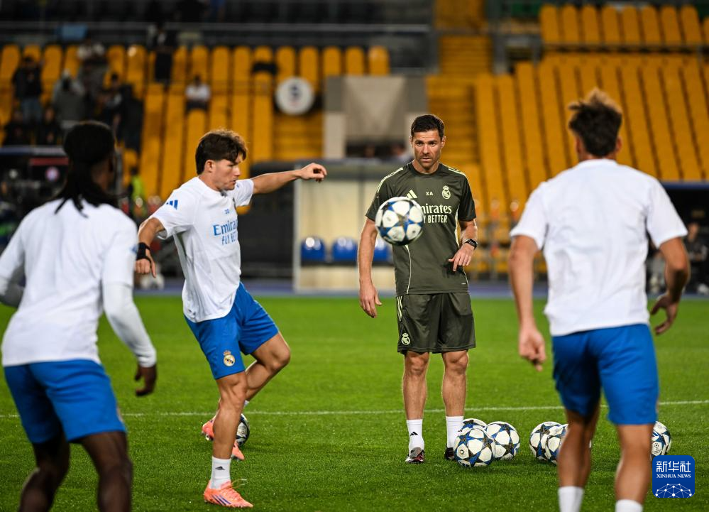 9月29日,皇家马德里队主教练阿隆索(左三)观看球员训练。