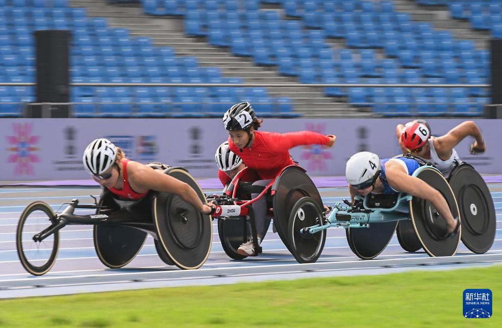 10月1日,中国选手周召倩(左二)在女子1500米T54级比赛中。最终,她获得该项亚军。
