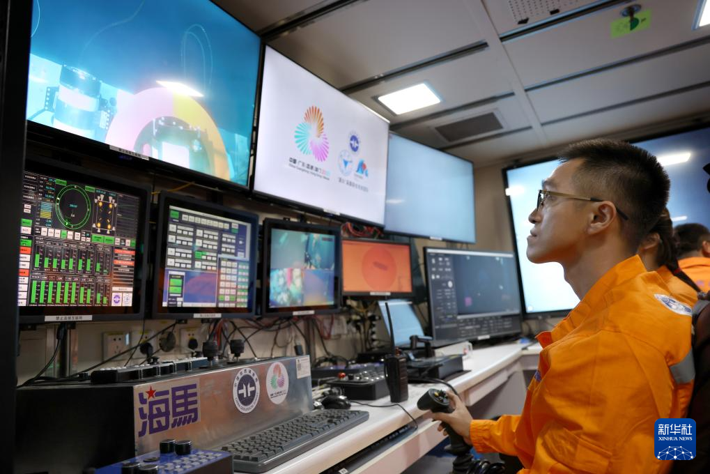 在科考船上的“海马”号深海遥控潜水器控制室里,工作人员遥控采火装置在海底进行作业(9月18日摄)。