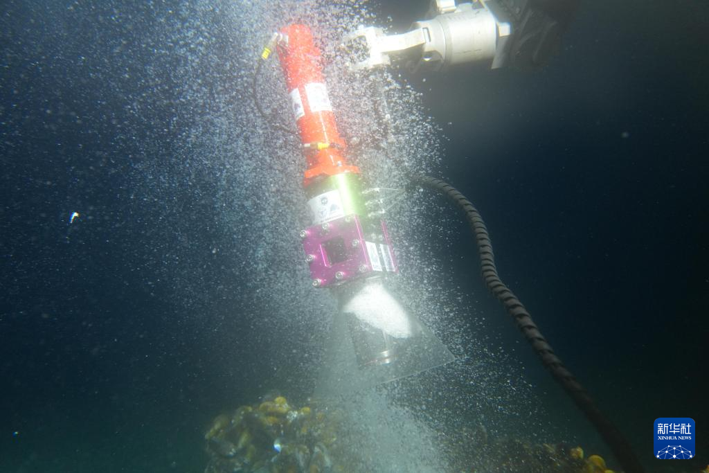 采火装置在海底冷泉喷口采集可燃冰(9月18日摄)。