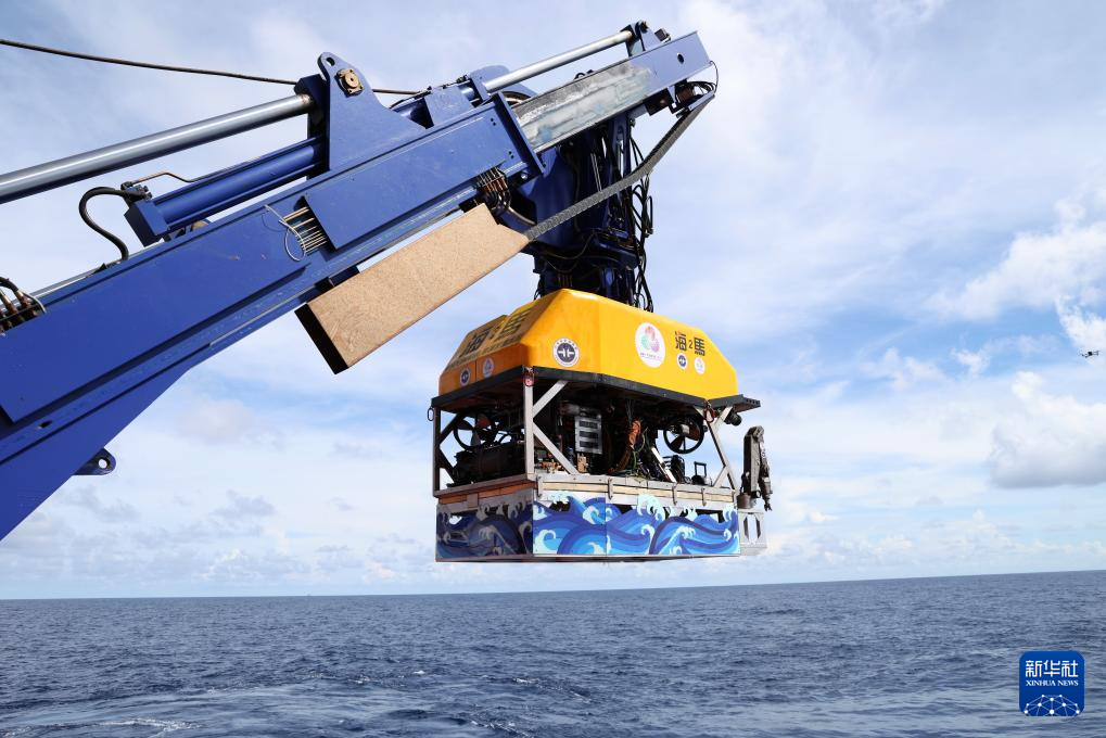 “海马”号深海遥控潜水器搭载着采火装置准备下水采集“源火”(9月18日摄)。
