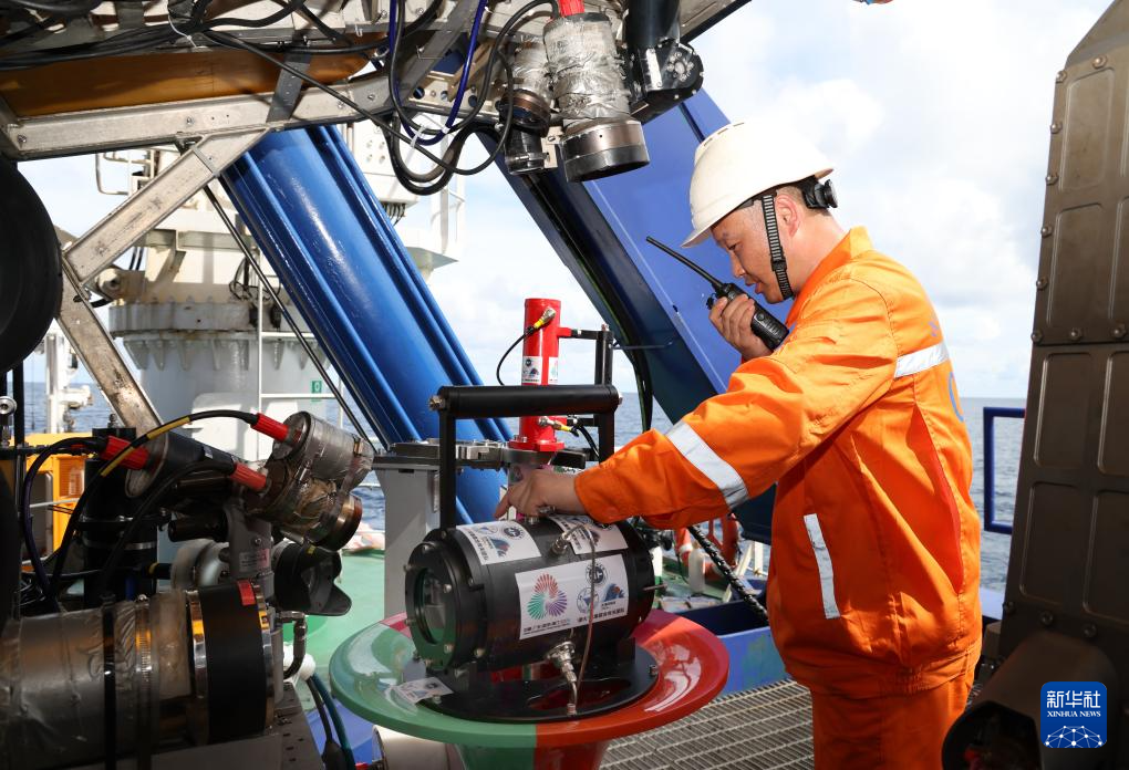 下水采集“源火”前,工作人员在调整搭载在“海马”号深海遥控潜水器上的采火装置(9月18日摄)。