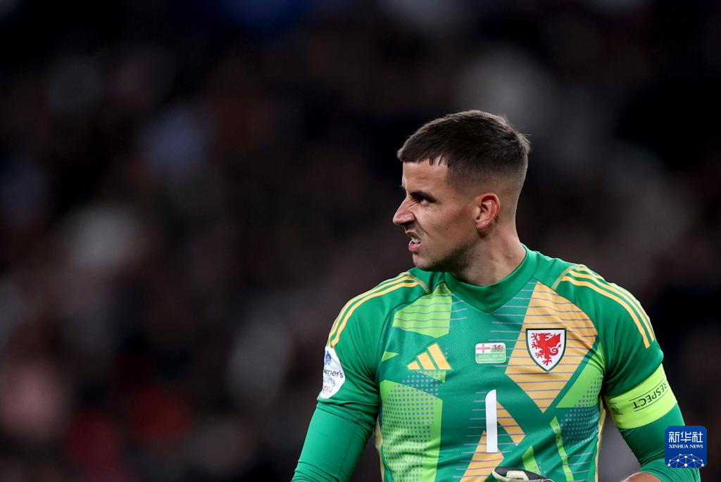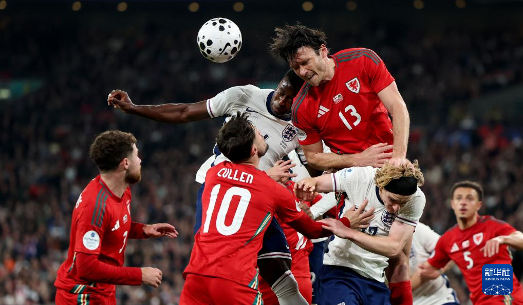 10月9日,英格兰队球员盖伊(上左)与威尔士队球员摩尔(上右)争顶。