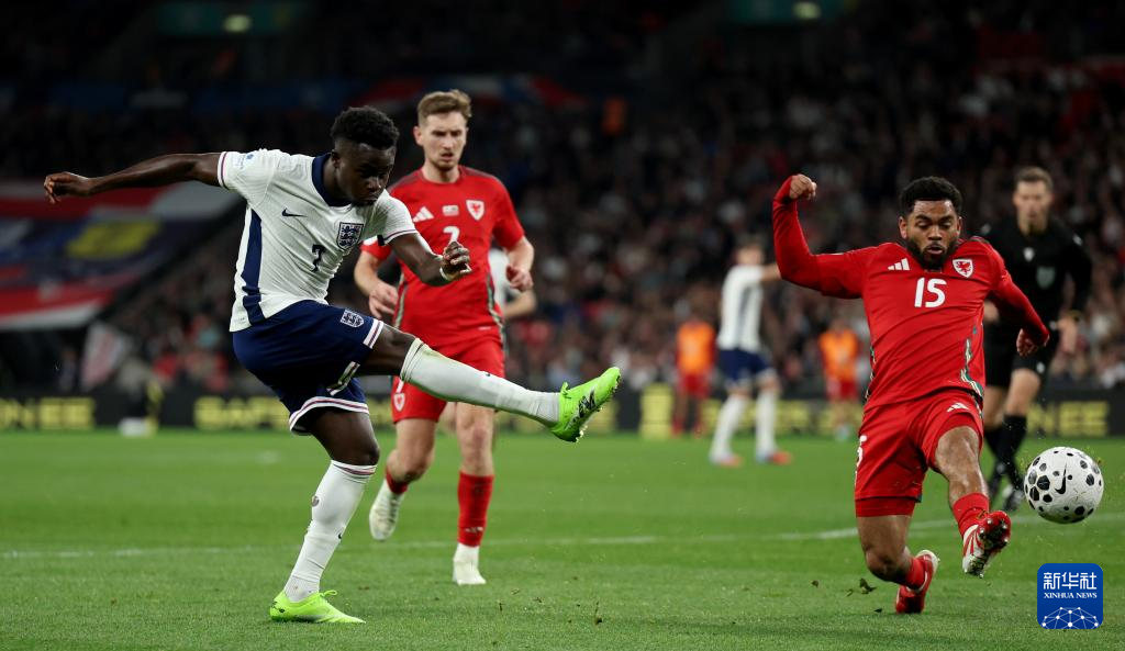10月9日,英格兰队球员萨卡(左)在比赛中射门。