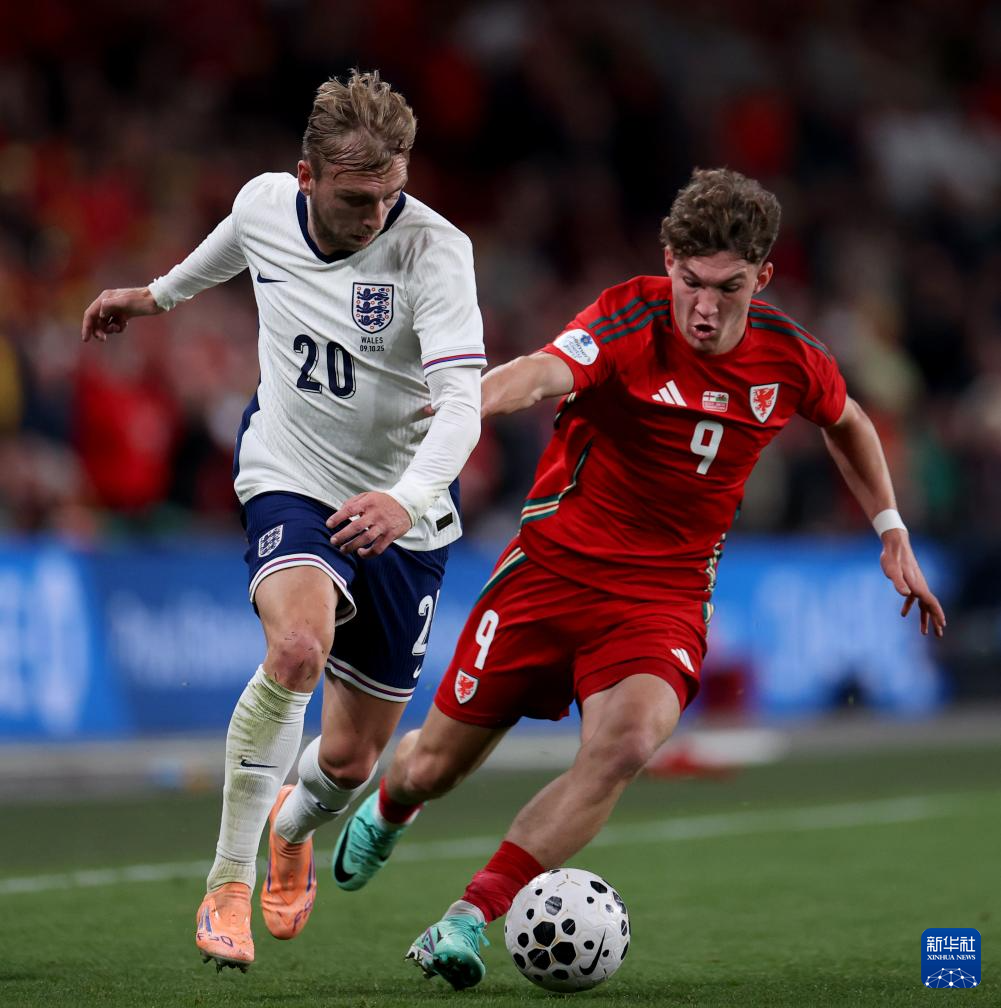 10月9日,英格兰队球员鲍恩(左)与威尔士队球员库马斯拼抢。